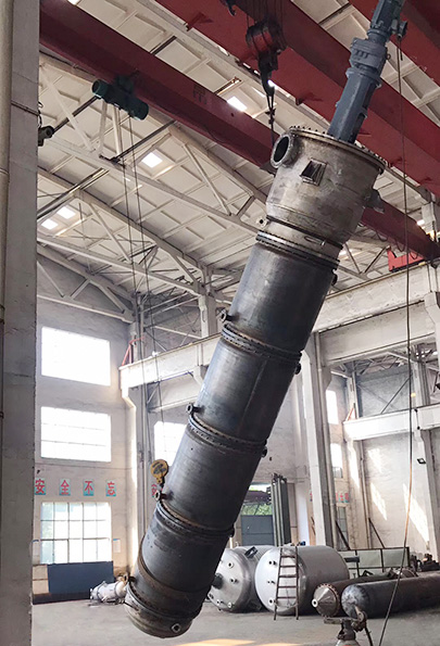 物料從加熱區(qū)的上方徑向進(jìn)入蒸發(fā)器;經(jīng)布料器分布到蒸發(fā)器加熱壁面,然后,旋轉(zhuǎn)的刮板式薄膜蒸發(fā)器將物料連續(xù)均勻地加熱面上刮成厚薄均勻的液膜,并以螺旋狀向下推進(jìn)。在此過程中,旋轉(zhuǎn)的刮板式薄膜蒸發(fā)器保證連續(xù)和均勻的液膜產(chǎn)生高速湍流,并阻止液膜在加熱面結(jié)焦、結(jié)垢,從而提高傳總系數(shù)。輕組份被蒸發(fā)形成蒸汽流上升,經(jīng)汽液分離器到達(dá)和蒸發(fā)器直接相連的外置冷凝器;重組份從蒸發(fā)器底部的錐體排出。